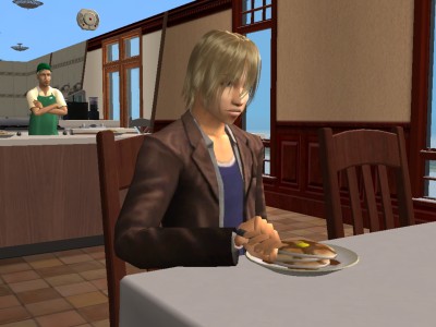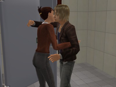 航太郎はエミーとハグ。うーん、絵麻が拒否った時より、エミーとの友好度、ずっと低いのに。やっぱりシムの性格が影響するんだろうな、これ。