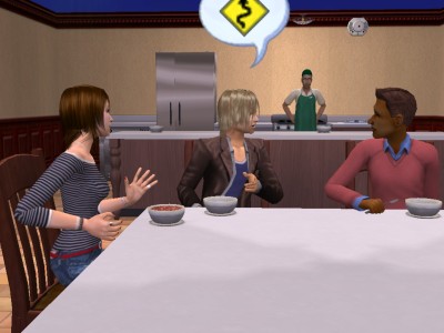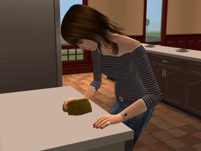絵麻は何故か、朝イチで調理台をせっせとお掃除。ううむ、さほど綺麗好きでもない設定でもこんだけ掃除するってことは、綺麗好きシムって結構鬱陶しいかもなぁ。何かするたびに掃除してそうだ。