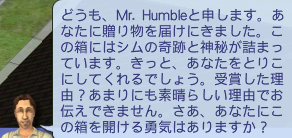 彼の名は、Mr. Humble。役目は「プレゼント配り」。ほんと、それだけのために存在してるという、気の毒なNPCです。(トラベラーズのツアーガイドより酷い…)
