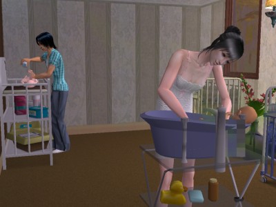 おむつ交換台を2つ置くスペースをとってなかったので、急遽、赤ちゃん用お風呂を用意(実態はシンクです)。これで2人同時にサッパリできました。