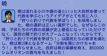 この日、暁の頭上に、燦然と輝くシムオリオンマークが。そう、暁も10万シムオリオンを達成してしまいました。教育者キャリアって、地味だけど、実はショービジネスの次に高給取りなんです。
