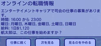 そう。航太郎、2度目の生涯願望チャレンジ。明日は土曜日なので、さっそく仕事です。全スキルMAXだから、スキルアップの必要なくて、ラクチンですね。