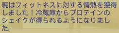 …えーと、プロテインは、他の食事やスナックと、何か効果が違うのかな。今回初めて見たアナウンスなので、プレイヤーも未経験です。今度暁に飲ませてみよう。