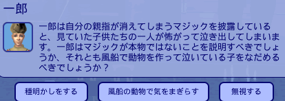 あらま。アルバイトでも選択肢出るんだ。う、うーむ…種明かしってタブーでしょ。ここはやっぱり、エンターティナーらしく、風船動物でいこう。